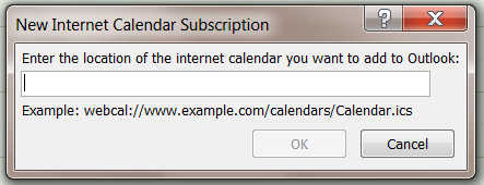 - The next dialog box asks you to enter the URL of the Internet Calendar. Finding the URL to enter into this dialog is the hardest part.