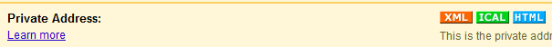 - This brings you to the calendar detail page. Look at the bottom of the page on the left side. See the heading for Private Address:? Click on the ICAL icon. This displays the URL you copy and paste into the dialog box in Step 3.