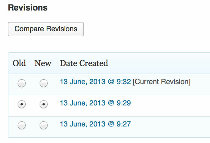 Note: It may be possible that the Revisions box is hidden on your screen or that revisions are turned off for your installation. If you don't see the Revisions box, follow these additional steps after you log into the admin area: